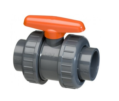 Двухходовой шаровой кран ПВХ для промышленного применения с гладкими муфтовыми окончаниями под клеевое соединение. Уплотнение из EPDM. Бренд: VDL